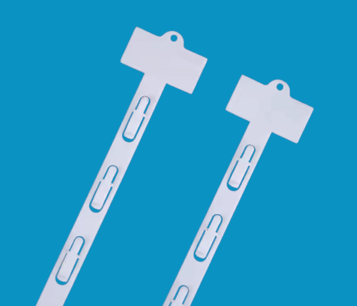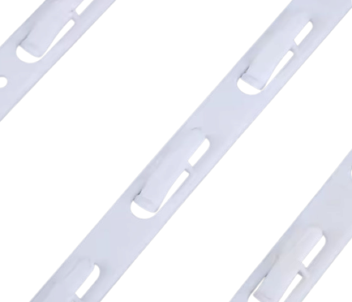 Biały plastikowy strip z topperem z podwójną możliwością zamocowania produktów: