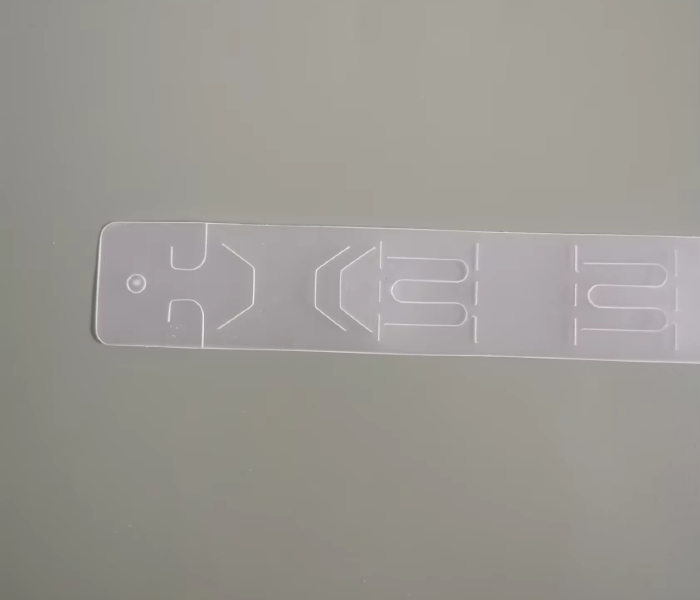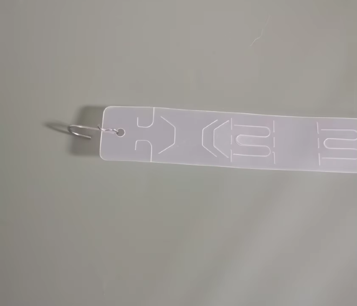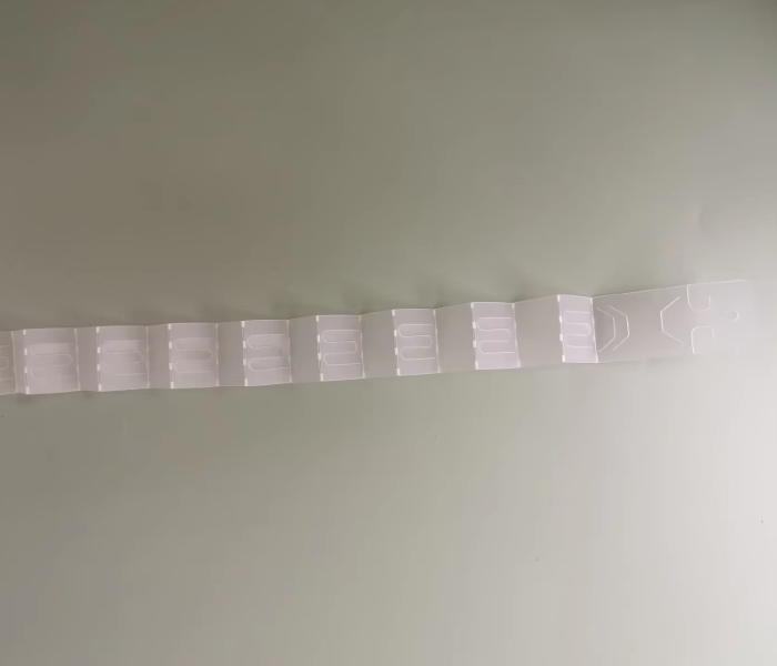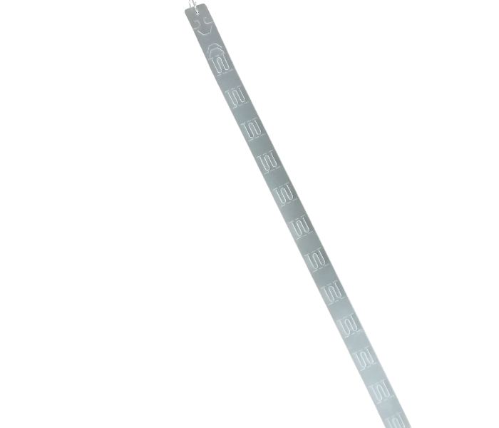 Strip reklamowy w kolorze mlecznym z 12 haczykami do ekspozycji lekkich produktów.