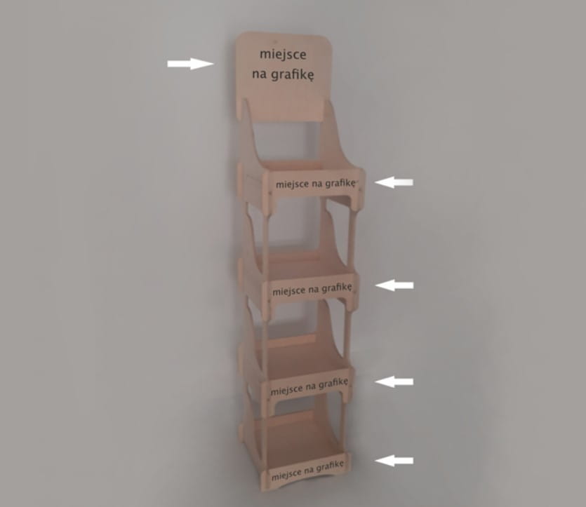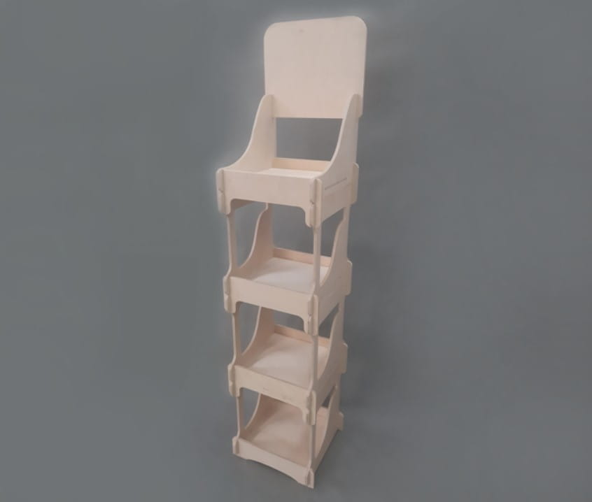 Regał stabilny i wytrzymały. Stand rekomendowany dla większości produktów tj.: butelki z napojami, puszki, chipsy, herbaty itp. Konstrukcja regału składa się z elementów wyciętych ze sklejki, które do siebie idealnie pasują.