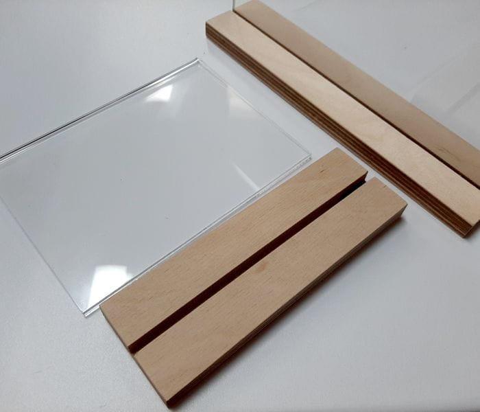 Stojaki na ulotkę A4 (orientacja pozioma) z podstawą ze sklejki i kieszenią plexi na ulotkę.