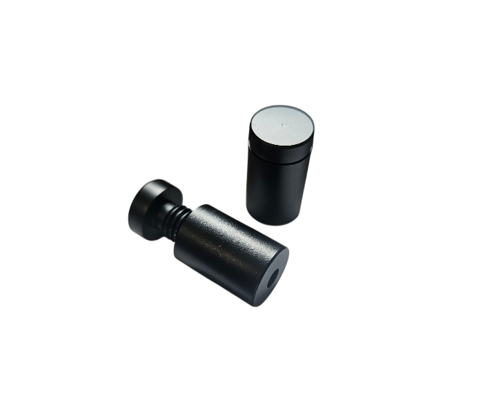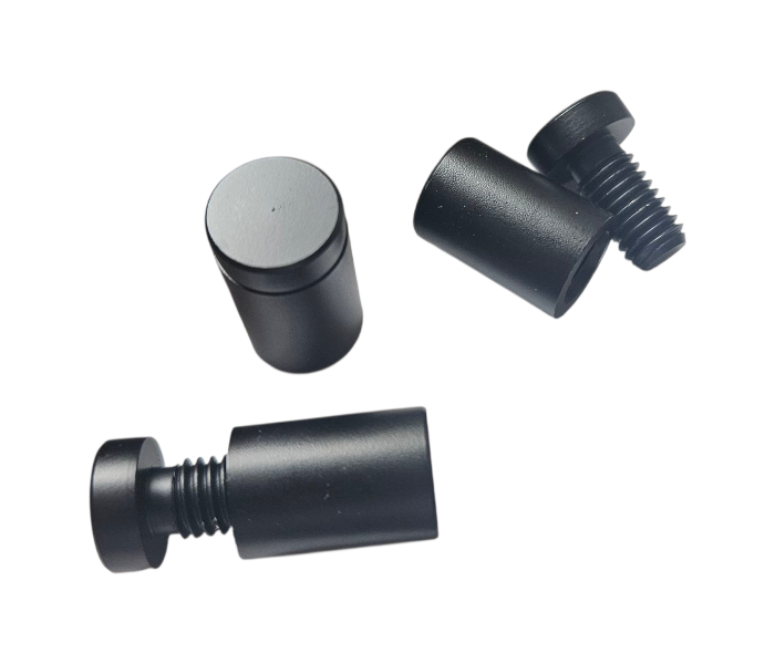 Czarne uchwyty dystansowe do tabliczek reklamowych z otworem.